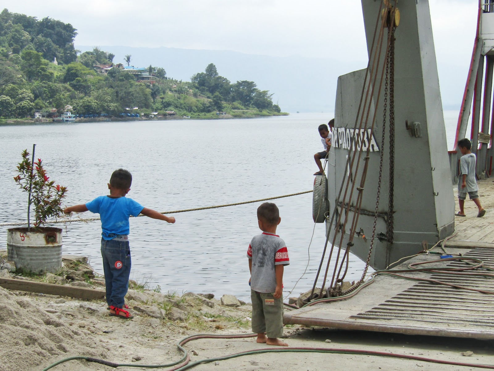 Sekelompok pria terlihat sedang mengelas bagian kapal Tao Toba 1. Terlihat juga beberapa anak kecil bermain disana. Mungkin mereka sudah terbiasa kali ya